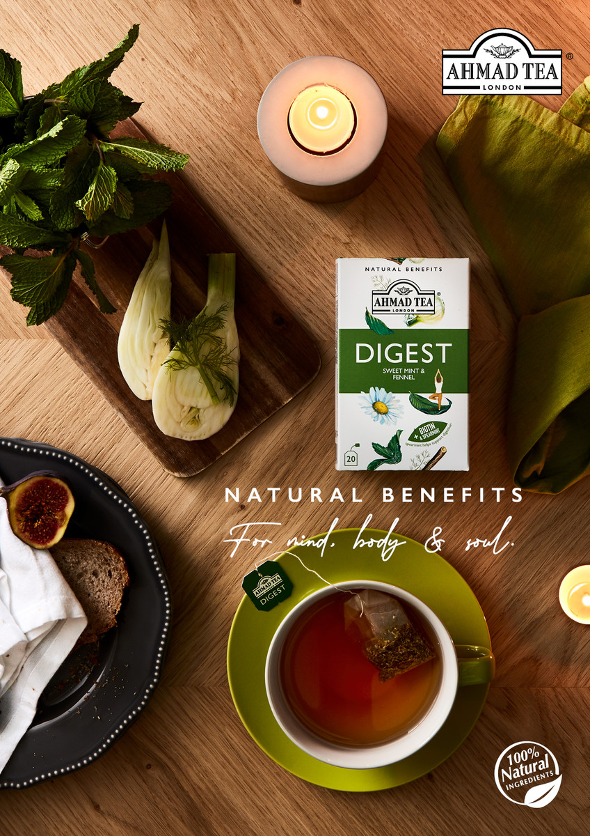 Για να φτιάξουνε αυτό το μείγμα, οι ειδικοί μας Tea Masters ξεκινούν συνδυάζοντας δυόσμο και μέντα. Η μέντα χρησιμοποιείται εδώ και αιώνες ως φυσική θεραπεία για προβλήματα πέψης, επομένως είναι η τέλεια βάση. Προσθέτουν ρίζα γλυκόριζας και μάραθο για τις υπέροχες γλυκές νότες γλυκάνισου, ενώ ένα πασπάλισμα με φύλλα χαμομηλιού και βατόμουρου δίνει μια λεπτή, καλοκαιρινή γεύση. Αλλά είναι η προσθήκη φυσικής βιοτίνης που πραγματικά ανεβάζει τις πεπτικές δυνάμεις αυτού του αφεψήματος. Η βιοτίνη βοηθά το σώμα να μετατρέψει την τροφή σε ενέργεια, η οποία με τη σειρά της συμβάλλει σε έναν πιο υγιή μεταβολισμό.